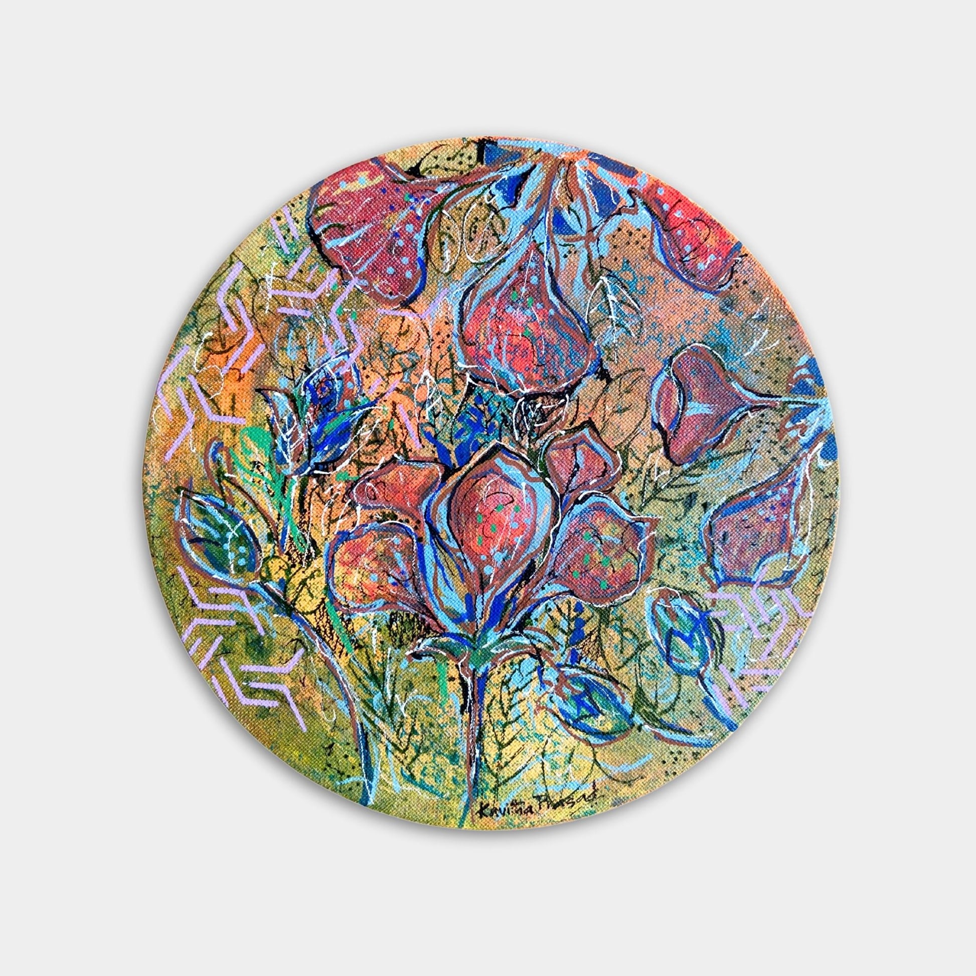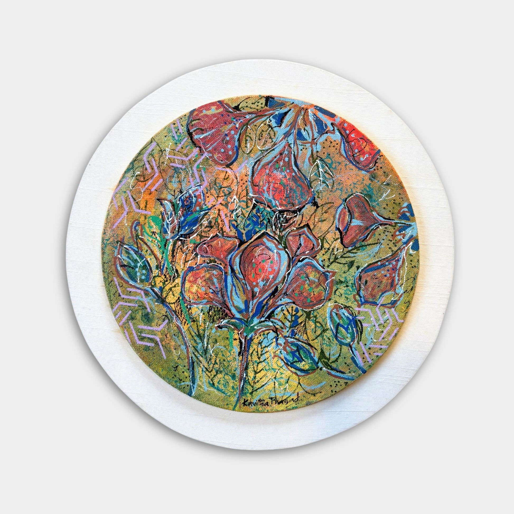 Radiant floral forms unfold in circular motion, their warm tones enriched by Kavitha’s intricate layering and subtle metallic luminosity.About the Artist