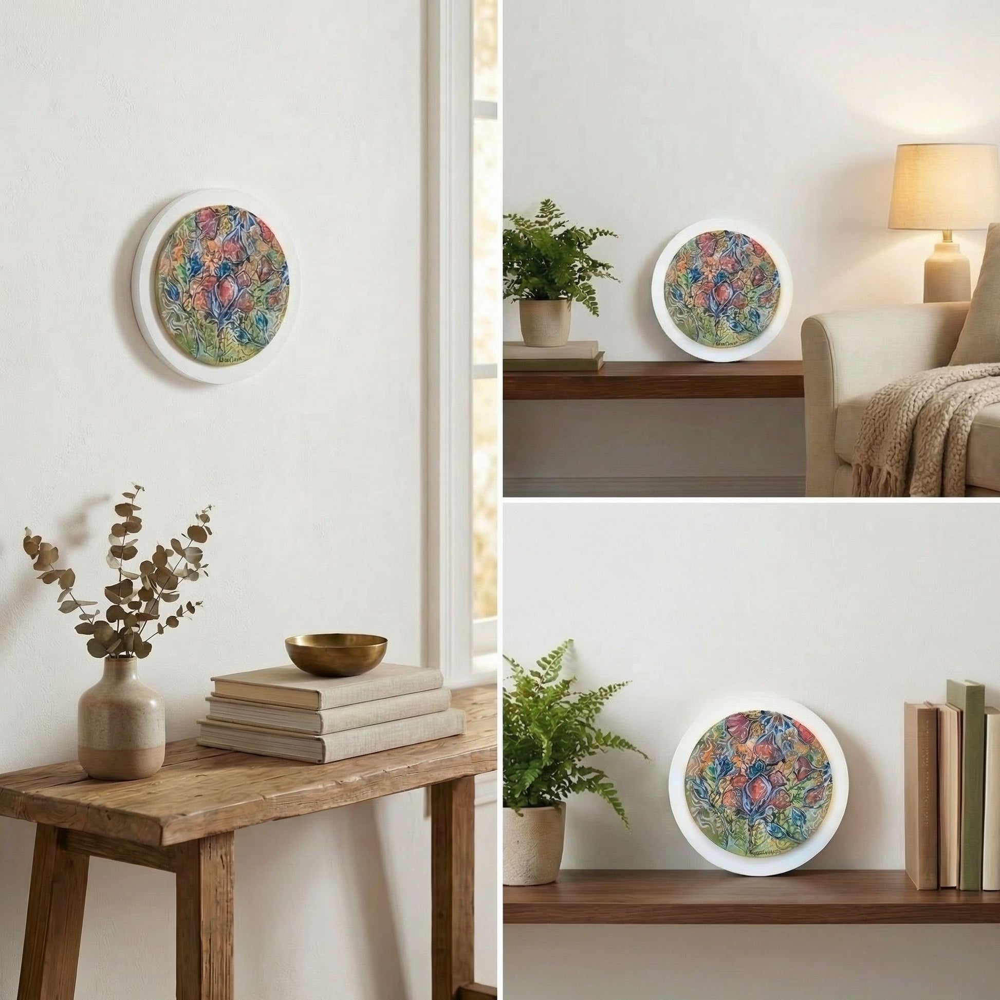 Pre-framed and ready to hang in a sleek white circular frame.