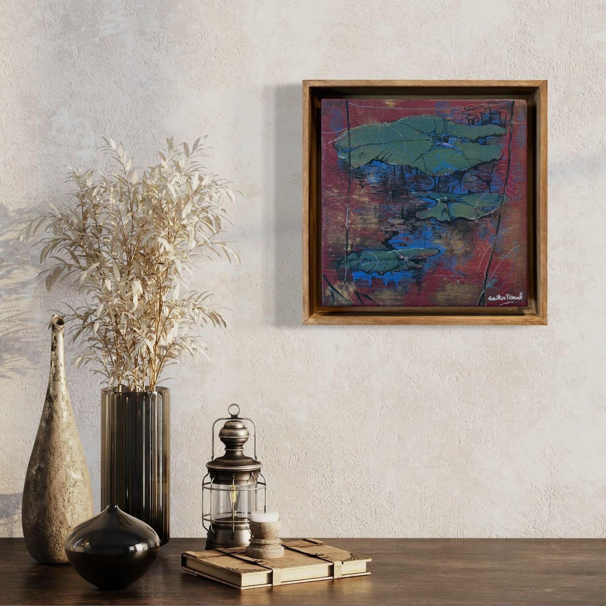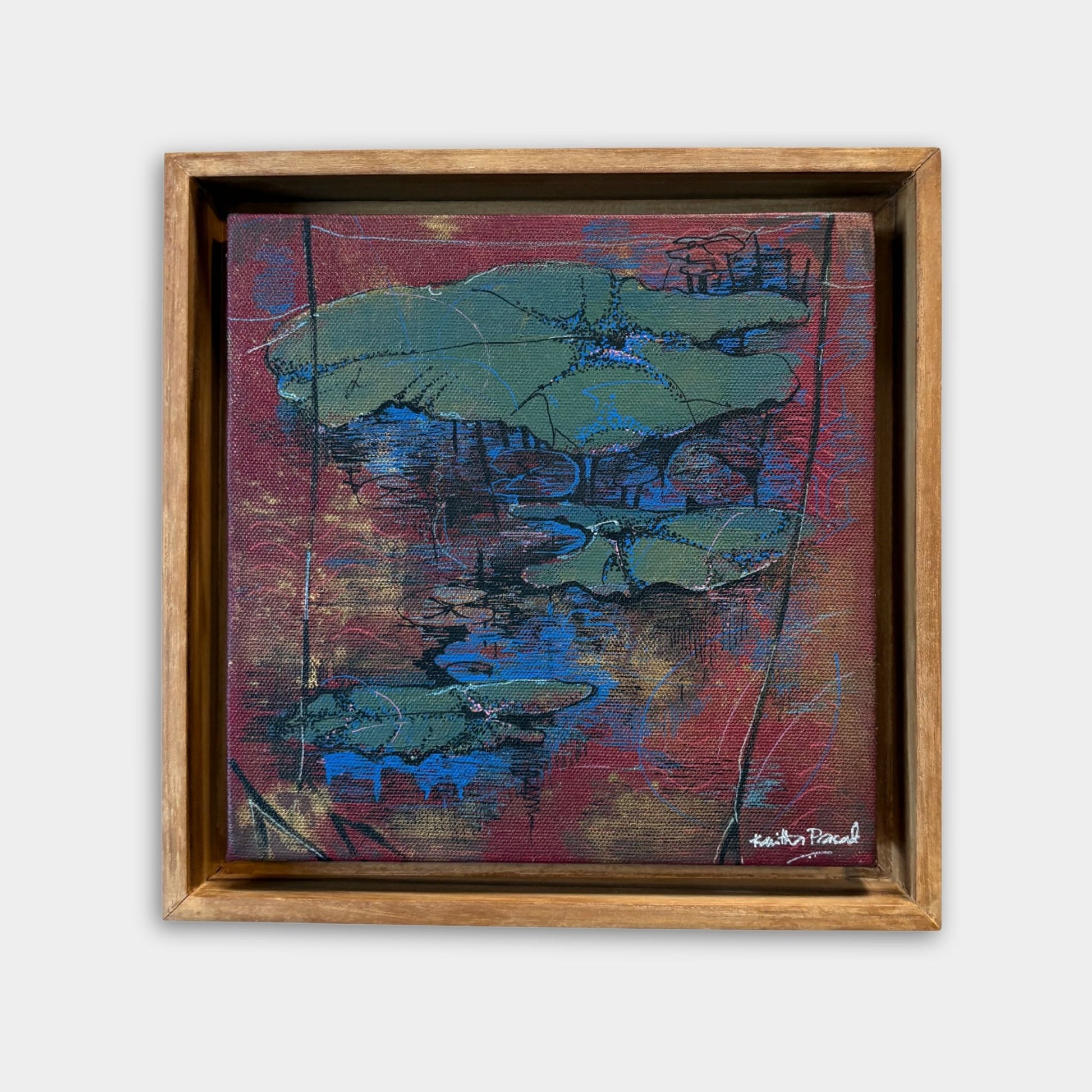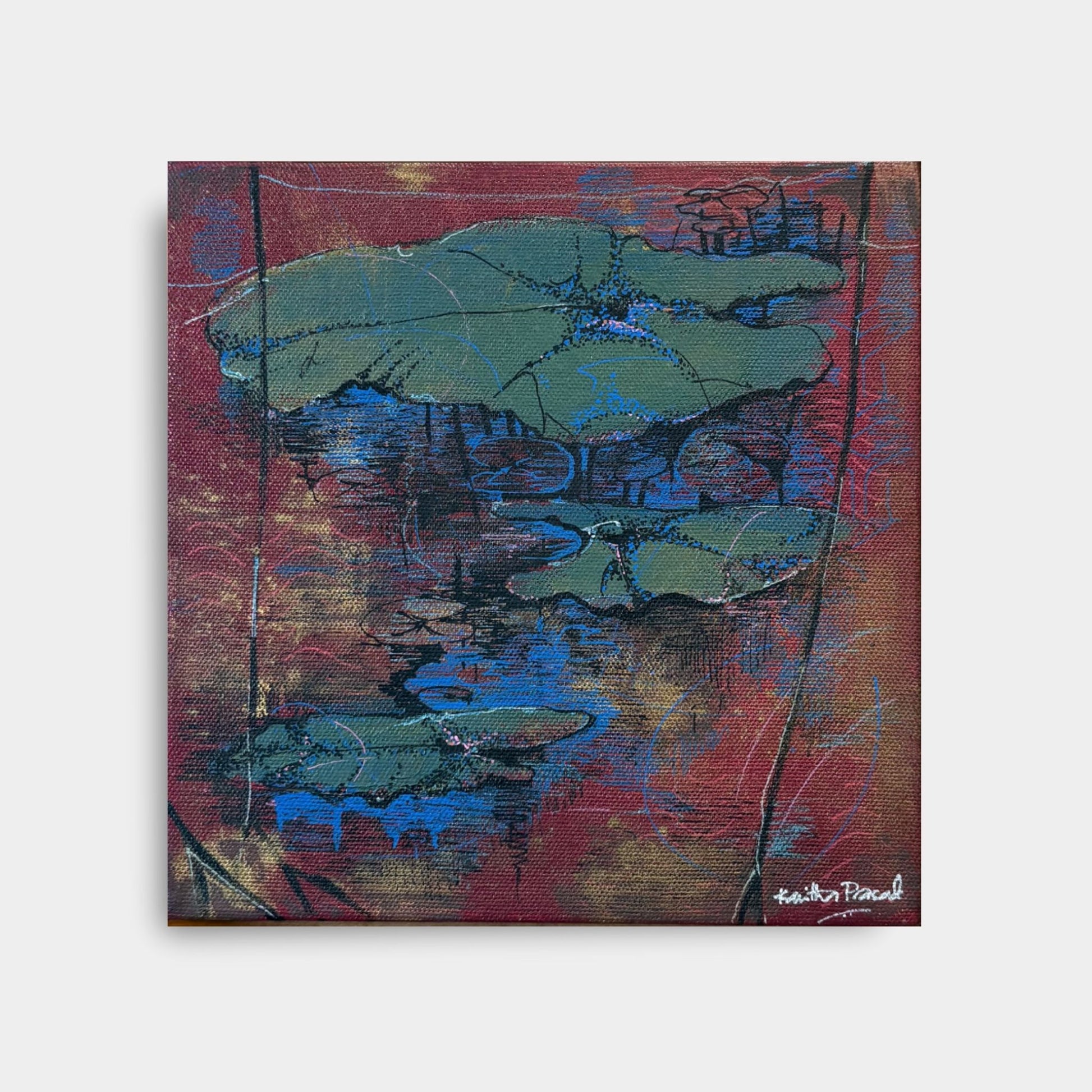 Soft blues and earthy reds form a delicate tension, allowing the layered leaves to emerge as quiet anchors within an abstracted pool of light.About the Artist