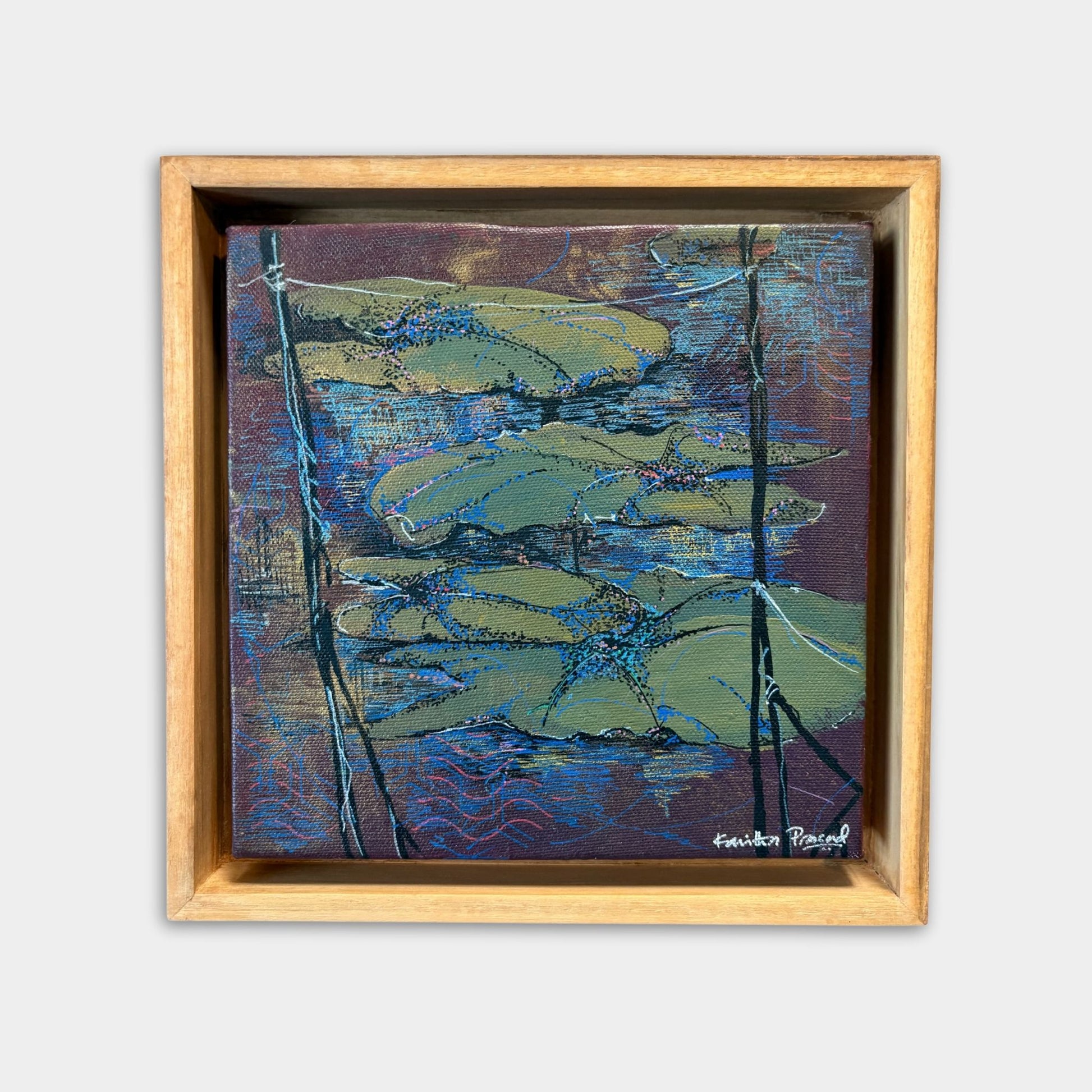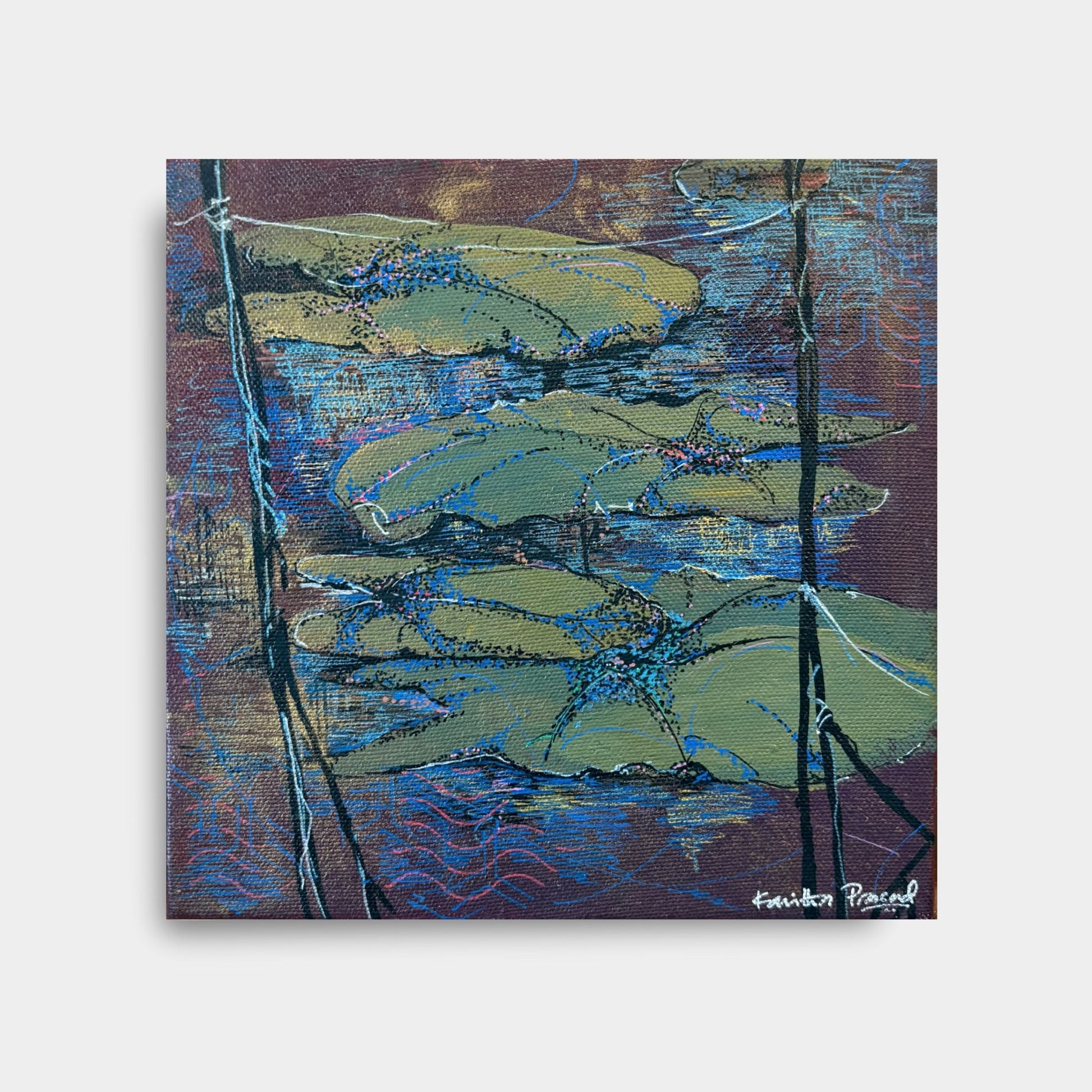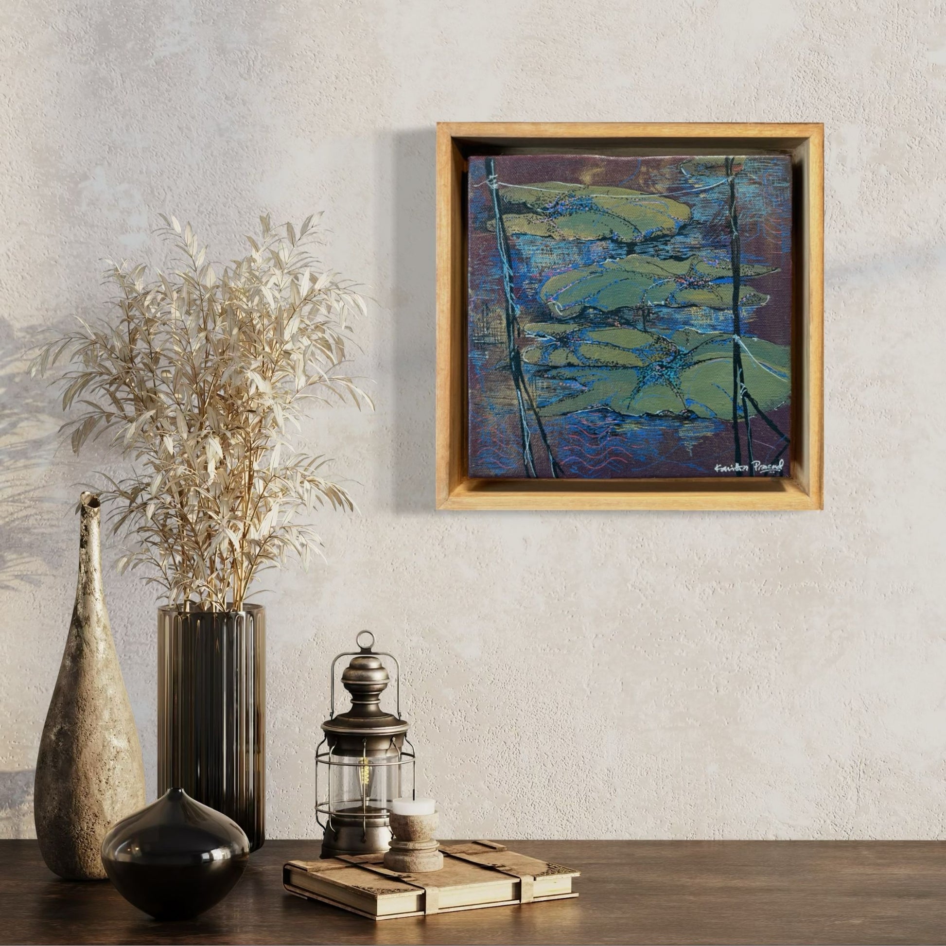 A quiet meditation on still water, where layered leaves drift over a dusky, reflective surface. Kavitha’s restrained palette draws attention to the subtle movement beneath the calm.About the Artist