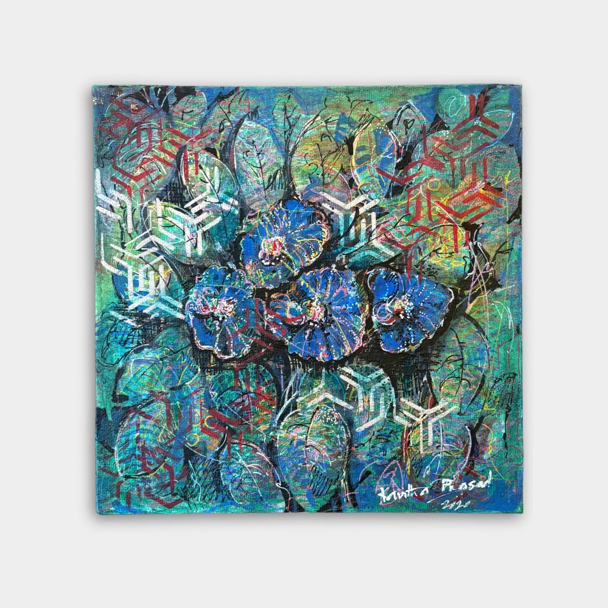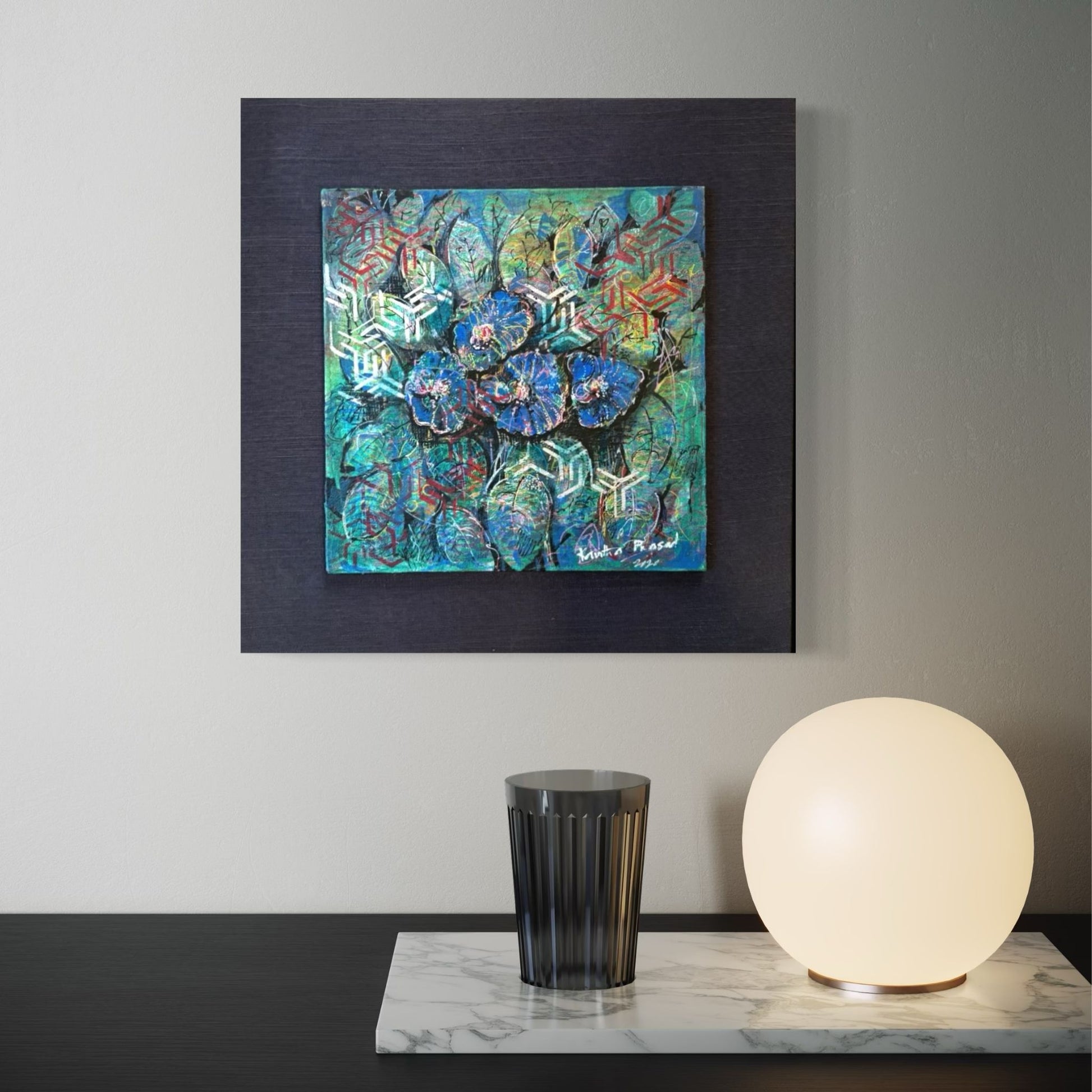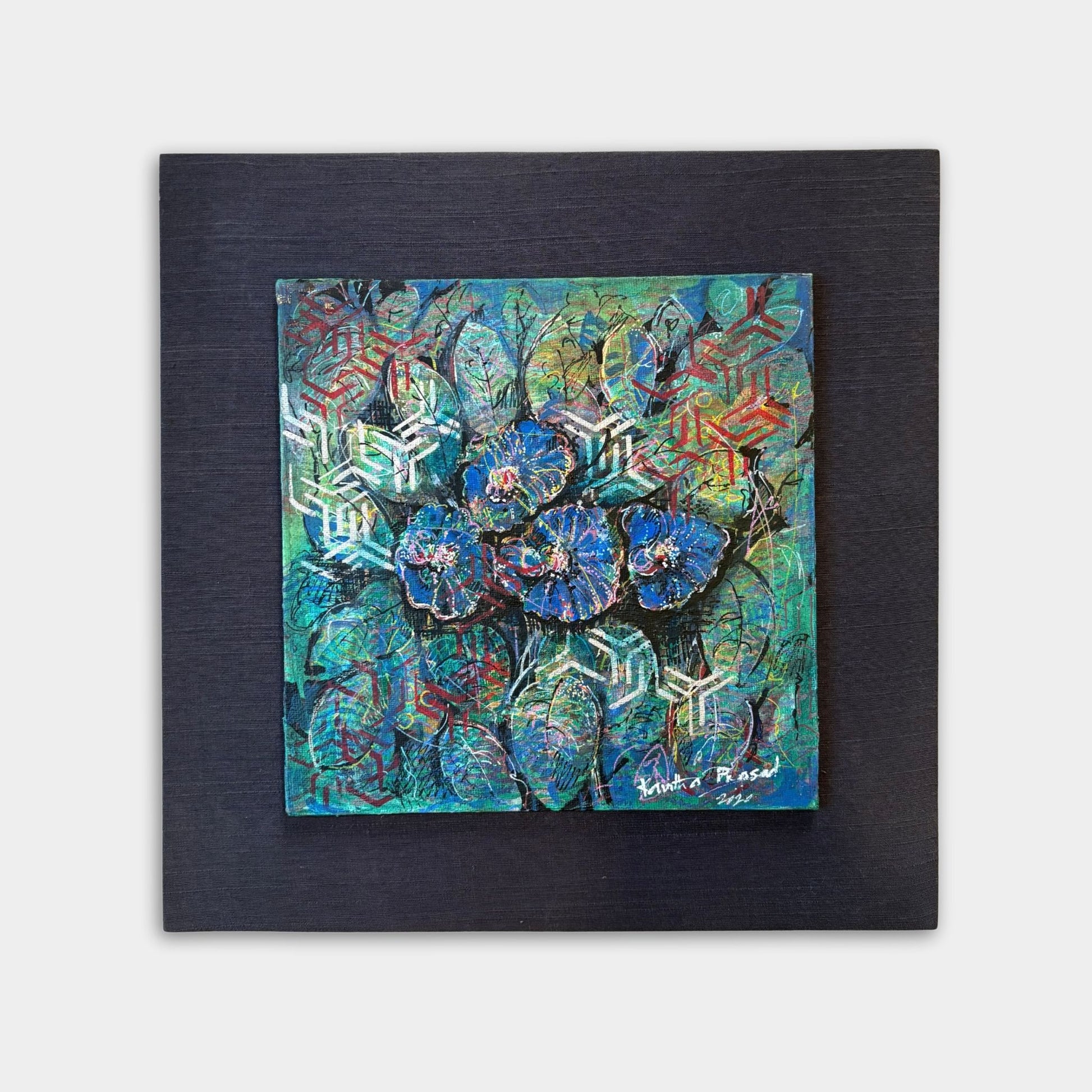 A cluster of deep blue blossoms rises through layered foliage, creating a textural rhythm across the surface.About the Artist
